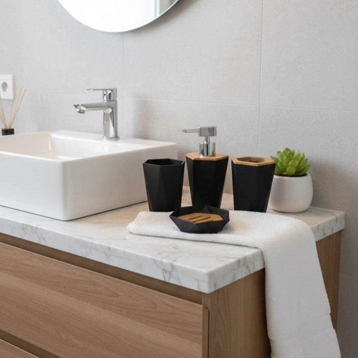 Hermoso set de baño de 4 piezas de plástico y bambú.
