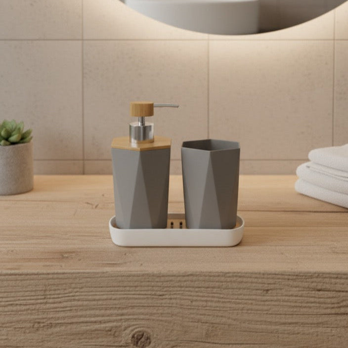 Hermoso juego de baño de 3 piezas de plástico y bambú.